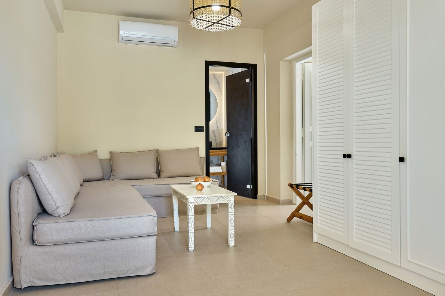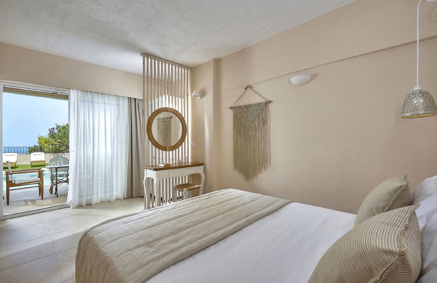 Ideal for families with one or two children, our One-Bedroom Apartments comfortably accommodate up to 4 guests. These apartments feature a private pool, a spacious garden furnished with sunbeds, an umbrella, and a shaded dining area, perfect for outdoor meals and relaxation. The outdoor area, including the pool, ranges from 50 to 70 square meters, offering plenty of space for both privacy and enjoyment.