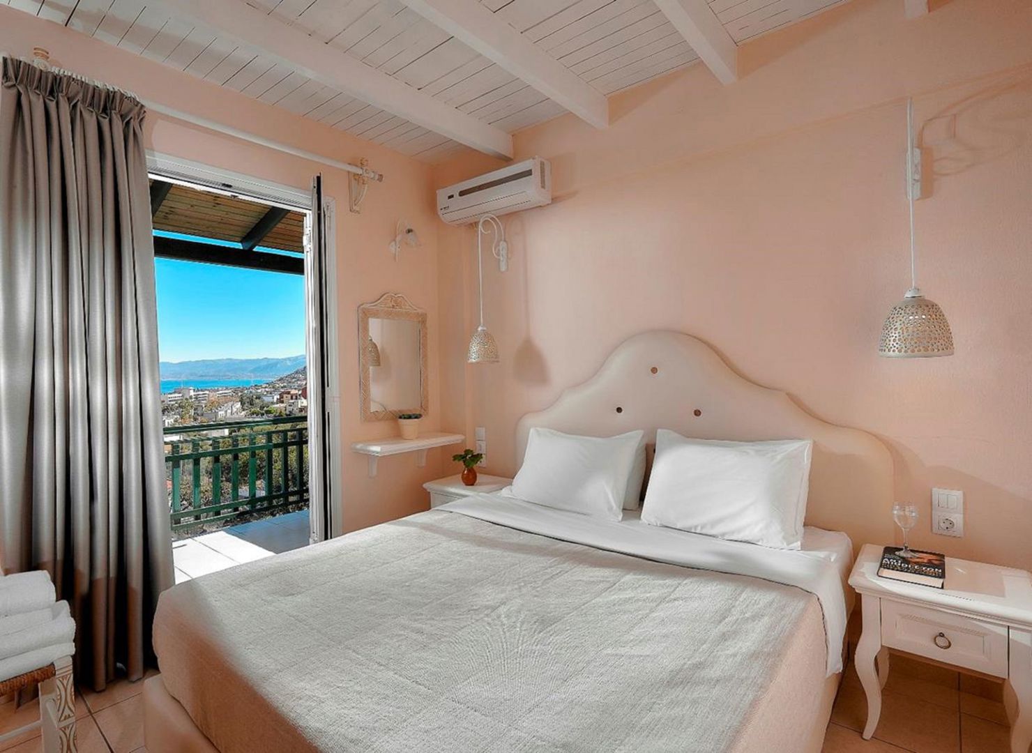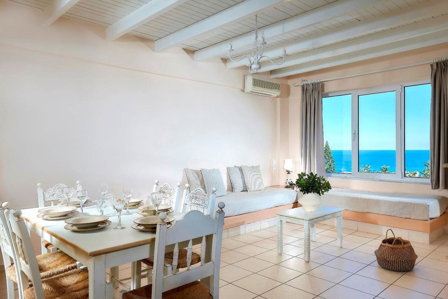 The Family Suite is a spacious 3-room apartment, located on the first floor above the main pool area, offering panoramic views of the sea and pool. This suite is ideal for families, featuring two separate bedrooms—one with a double bed and the other with two single beds—plus a cozy lounge area with two additional single beds.